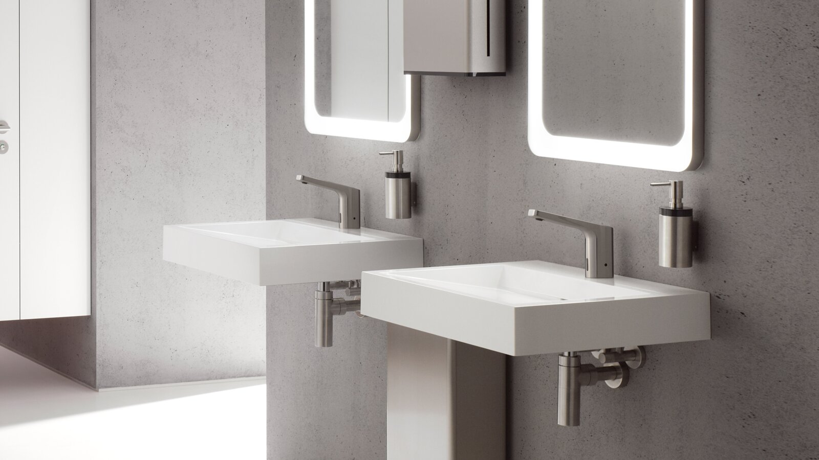 • Spiegel: Ein Spiegel, der bis zur Waschtischoberkante reicht oder durchgehend ausgeführt ist, stellt sicher, dass sich alle Personen – unabhängig von ihrer Körpergröße oder Sitzposition – darin sehen können. Sollte dies baulich nicht realisierbar sein, können Kippspiegel die dieale Lösung sein.