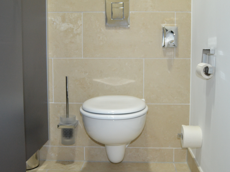 The vertical structure of the original KPM buildings is taken up by the striking window design. The clear lines are continued inside the new building. 100 System 100 from HEWI was selected for the sanitary room fittings.
