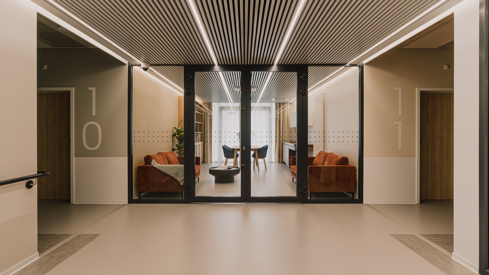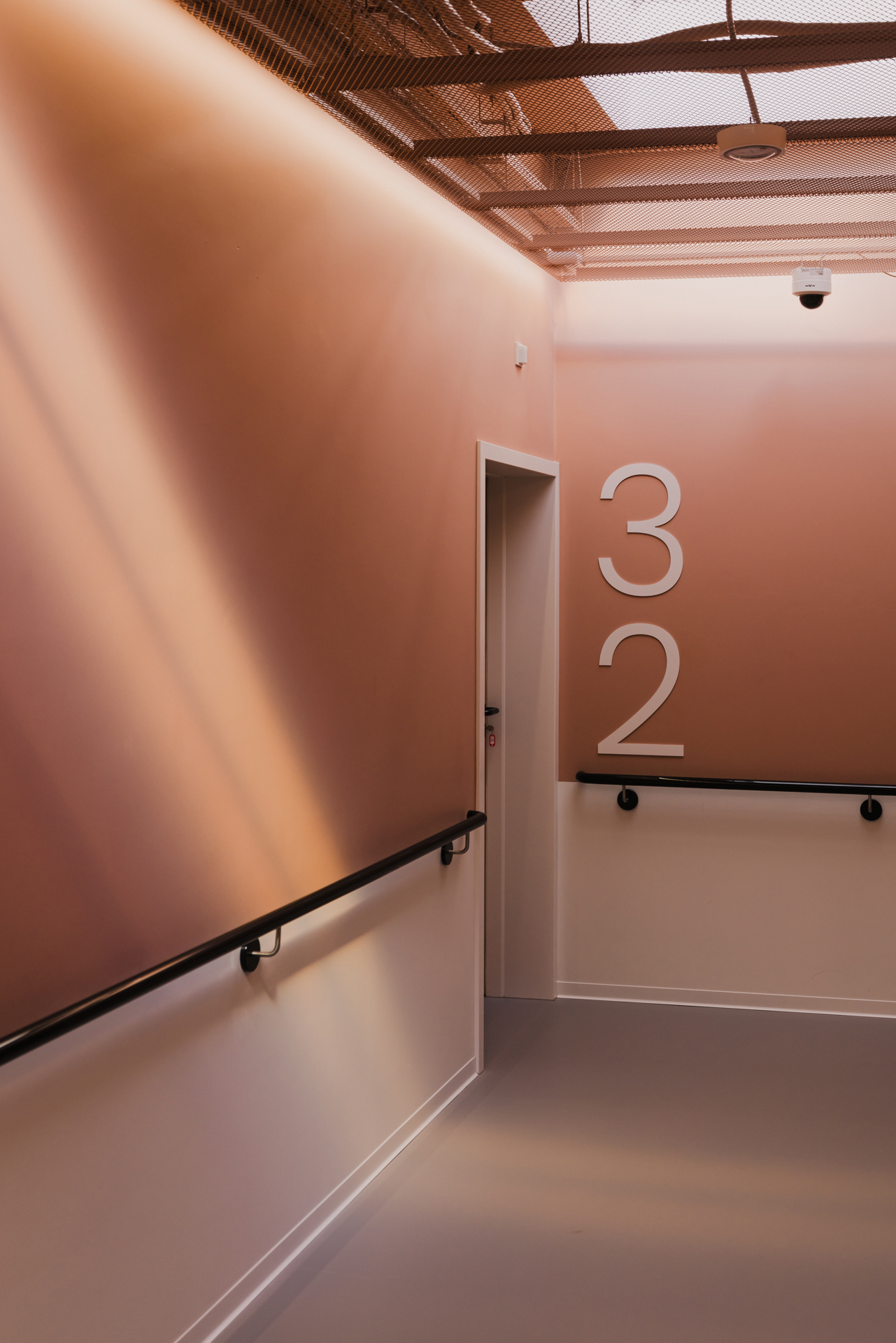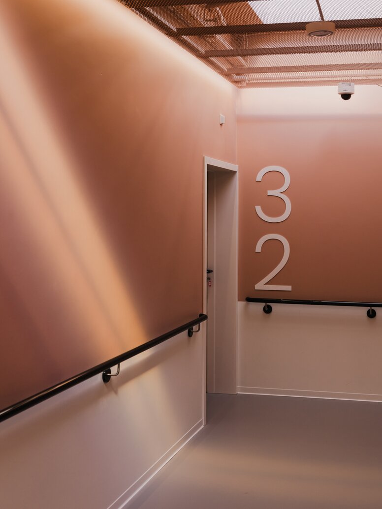 This effect is supported by the division of the building into different colour zones. The targeted use of colours and colour contrasts on stairs, doors and functional elements also makes it easier for people with visual impairments or dementia to see and perceive them. This can be clearly seen, for example, in the main staircase: a harmonious combination of terracotta-coloured perforated sheeting and light wood, which contrasts strongly with the pale walls and at the same time marks the clear spatial separation of the staircase.