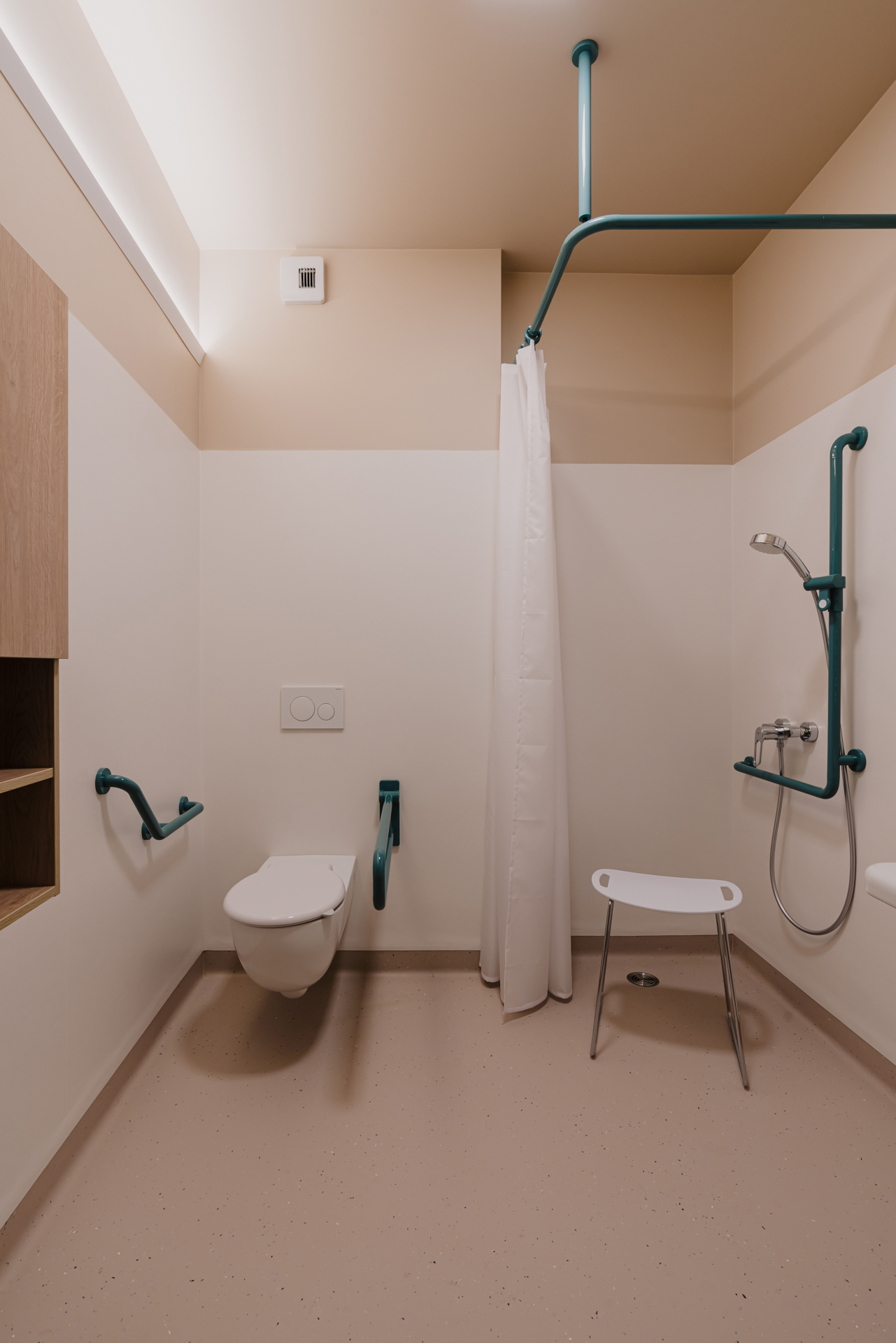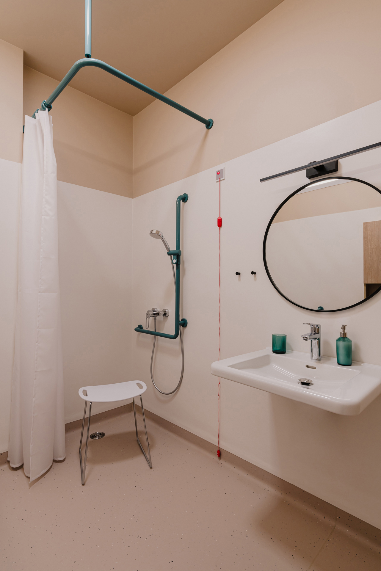 The fittings and sanitary products (angled grab bar, hinged support rail, shower curtain rail with ceiling support, towel rail) in aquablue from the 801 series add cheerful accents to the bathroom and, with their functional design, meet all the requirements for unrestricted use. In the corridors, the ENTRO handrail systems are used in high-contrast black, providing reliable support. The HEWI classic from the System 111 hardware series is also installed in timeless black. Designed by Rudolf Wilke in 1969, the lever handle has long been considered a design icon and is part of the brand’s distinctive, design-focused language. The high-gloss polyamide solutions meet strict hygiene standards thanks to their non-porous and easy-to-clean surfaces.